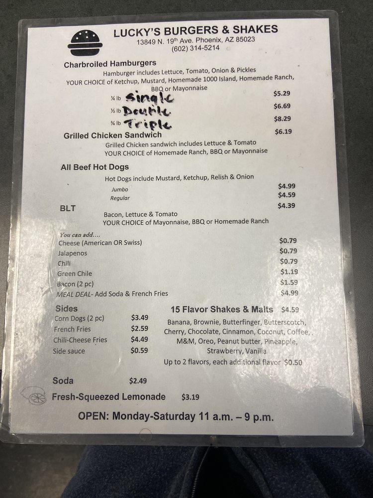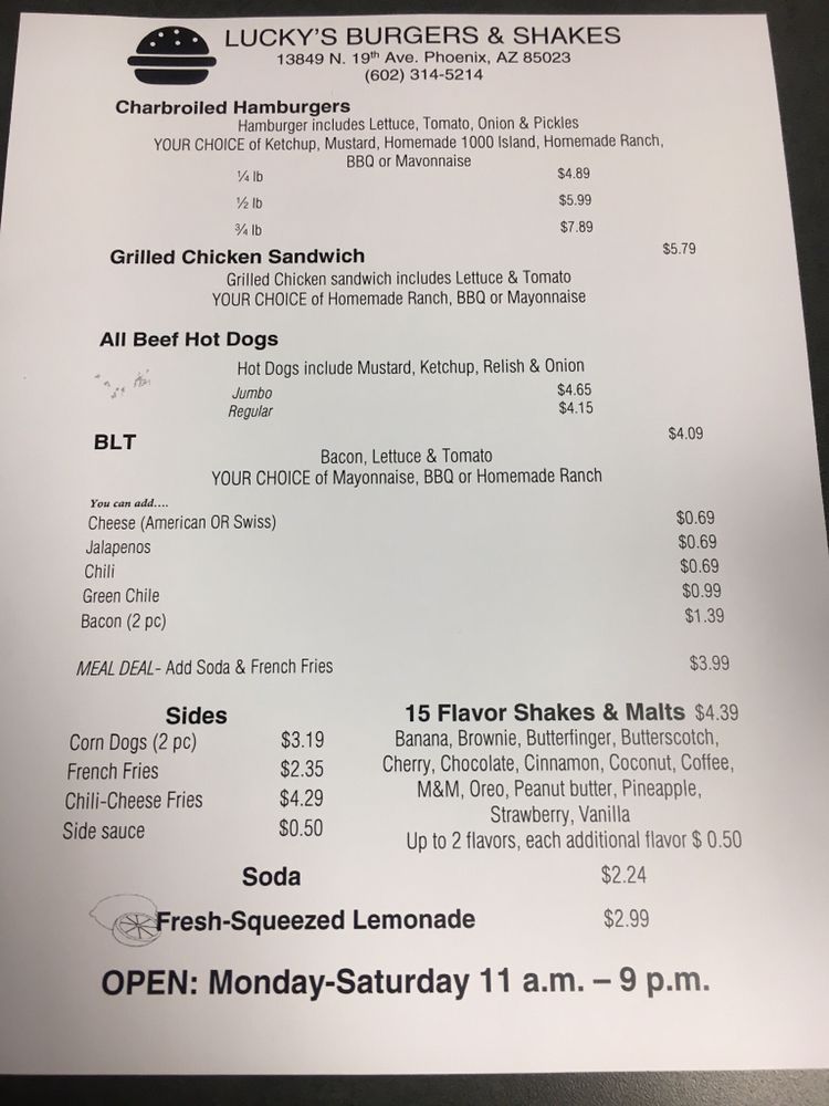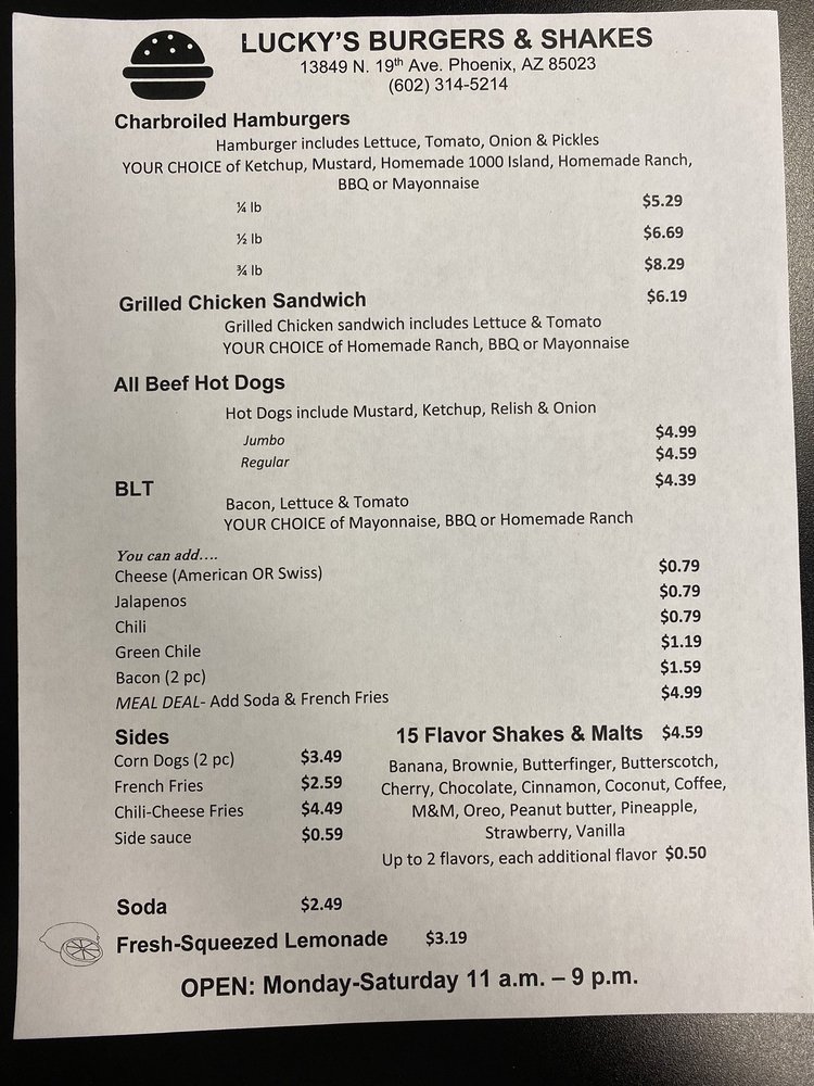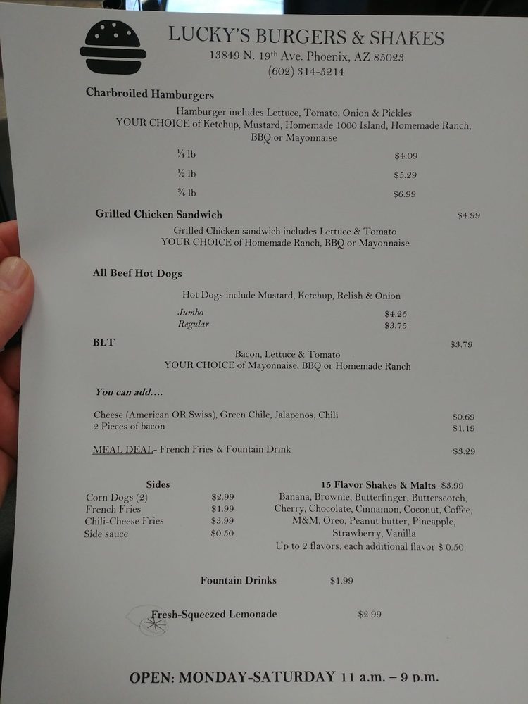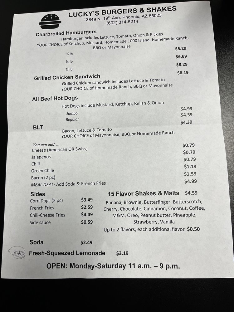 Welcome to Lucky's Burgers, a fast-food joint located in Phoenix, AZ, specializing in mouth-watering American burgers. With a plethora of utilities such as delivery, takeout, and even outdoor seating, Lucky's caters to every burger lover's needs. Customers rave about the juicy burgers, perfect fries, and excellent service. Whether you're craving a classic cheeseburger or want to try something new like chili fries with sliced cheese, Lucky's has got you covered. The casual and classy atmosphere, along with great customer service, make it a go-to spot for families and friends. So if you're in the mood for a delicious burger and shake combo, make sure to stop by Lucky's Burgers for an unforgettable dining experience.